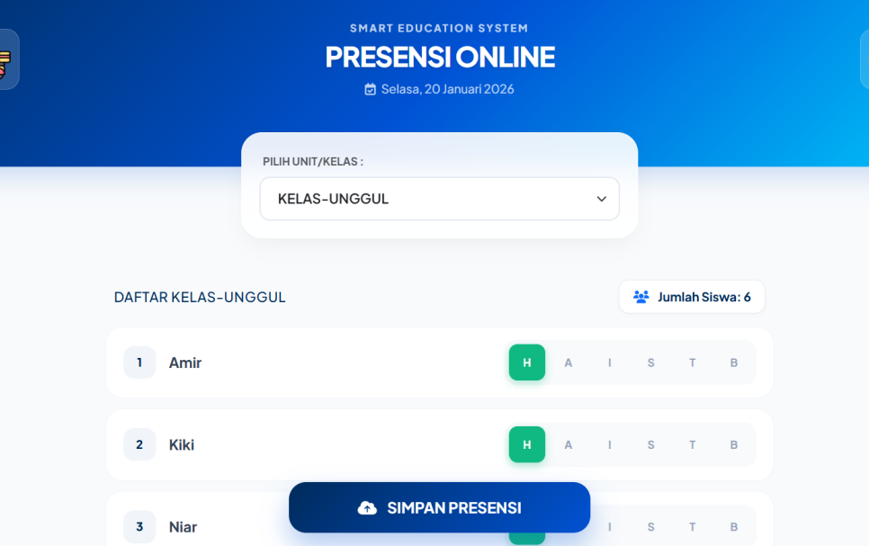 4. Tandai status kehadiran (H/A/I/S/T/B).